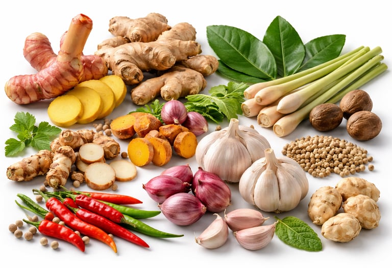 A rustic kitchen scene with authentic Balinese cooking tools and loba spice jars glowing under soft lighting.